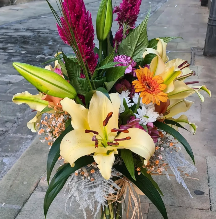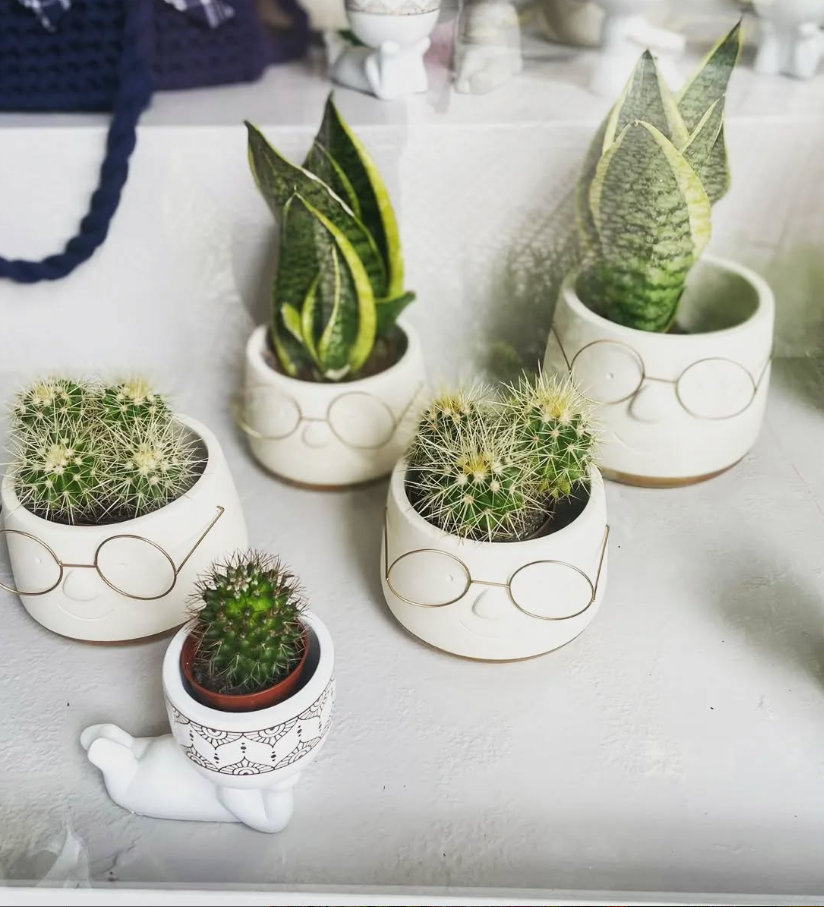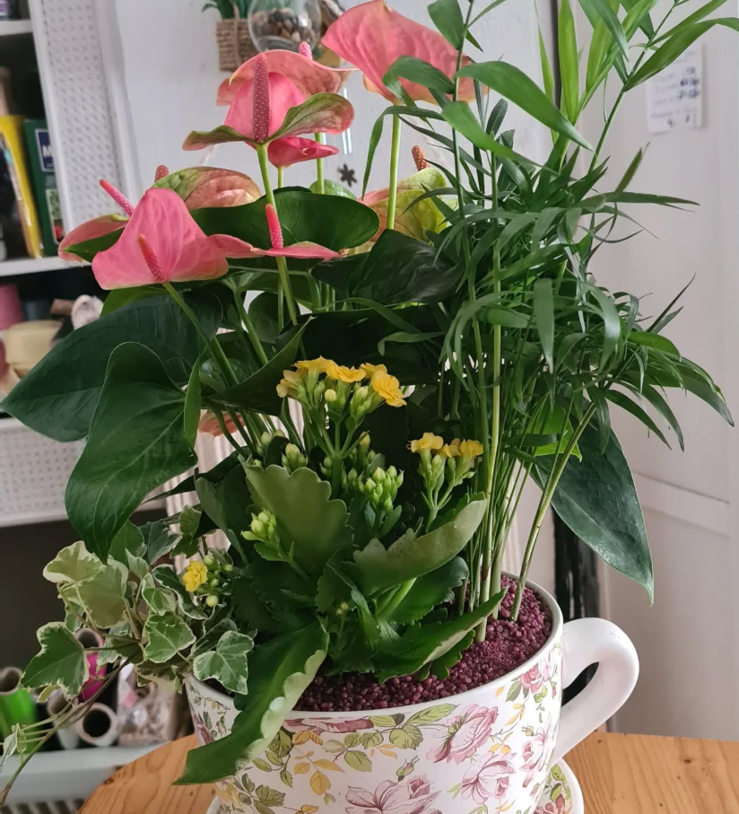 Tiestos varios, plantas de interior y exterior, flores artificiales.
